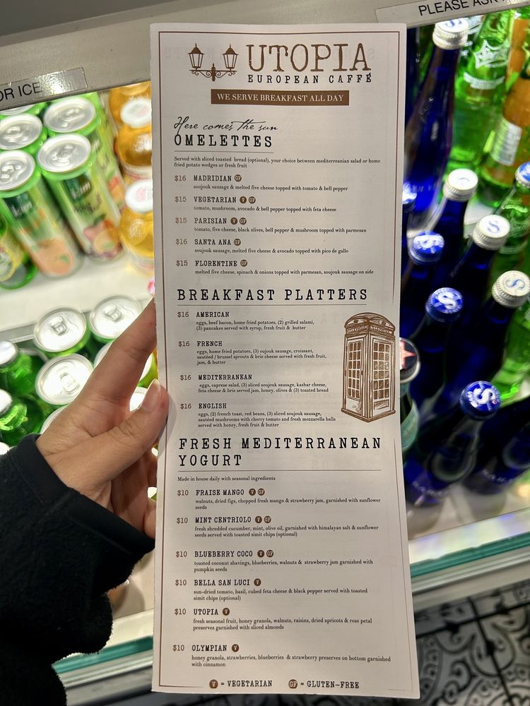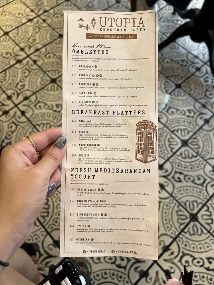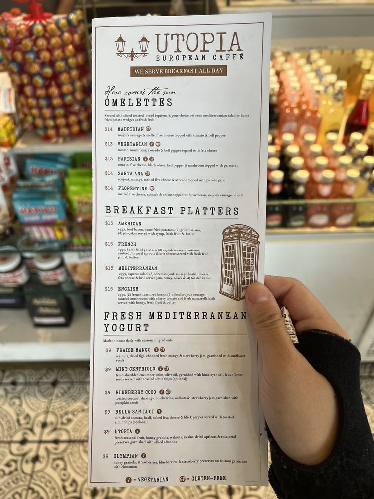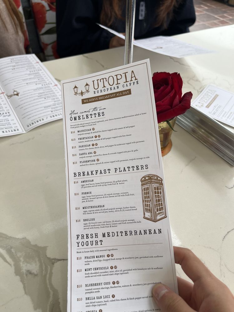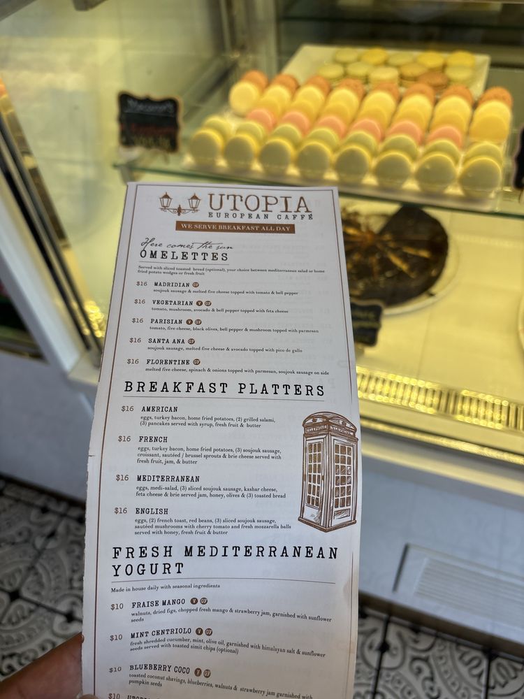 Introducing the menu at Utopia Caffe, a trendy and intimate cafe located in Tustin, CA. Offering a diverse range of options, from omelettes like the Madridian soujouk sausage with melted five cheeses to fresh Mediterranean yogurt topped with fruity delights. The American platter and classic sandwich showcase delicious and filling choices. The cafe's decor transports you to Istanbul, with imported items from Europe adding to the ambiance. Customers rave about the friendly staff, delicious Turkish coffee, and flavorful dishes. Vegan options are available, catering to a variety of dietary preferences. Don't miss out on the big portions, cute decor, and lovely outdoor seating at Utopia Caffe. This elegant brunch spot with a Parisian vibe is a must-try for any food enthusiast.